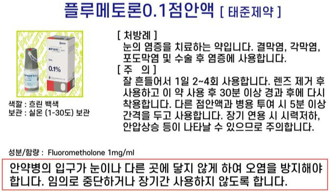 - 용법 및 용량: 일반적으로 1회 1~2방울을 1일 2~4회 점안합니다. 정확한 사용 횟수와 기간은 의사의 지시에 따라야 합니다.