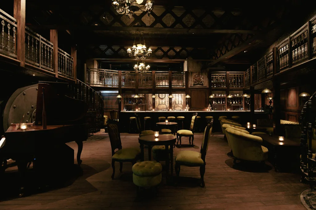 내부에 들어서면 마치 시간 여행을 한 듯한 느낌을 받게 됩니다. 인테리어는 1930년대 상하이의 모습을 재현했으며, 마치 오래된 은행 건물을 개조한 듯한 분위기를 자아냅니다. 골동품 스타일의 금고문, 나선형 철제 계단, 은행 창구를 연상시키는 바 등이 특징적입니다.