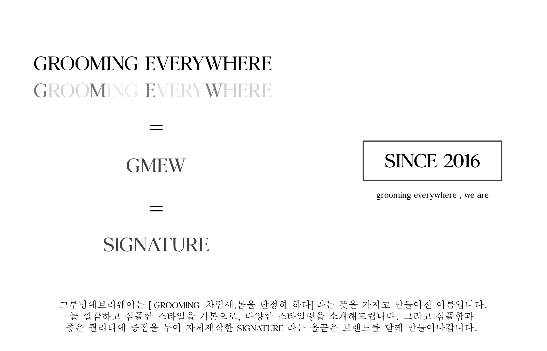 GROOMING EVERYWHERE is a Korean fashion brand embodying the concept of "grooming everywhere you go". It's loved for its designs that are both fundamental and refined. The brand's core philosophy centers on finding beauty in simplicity.